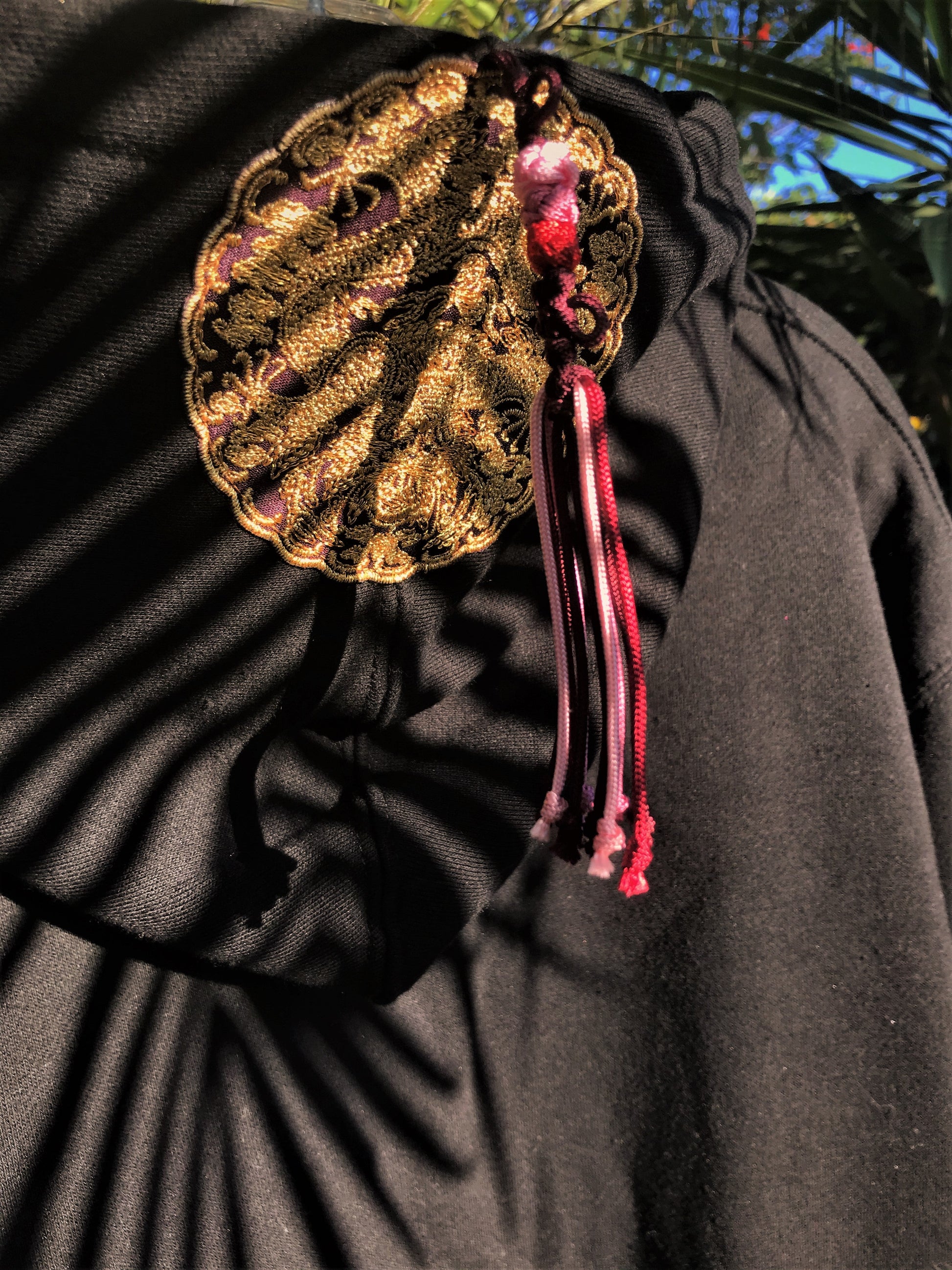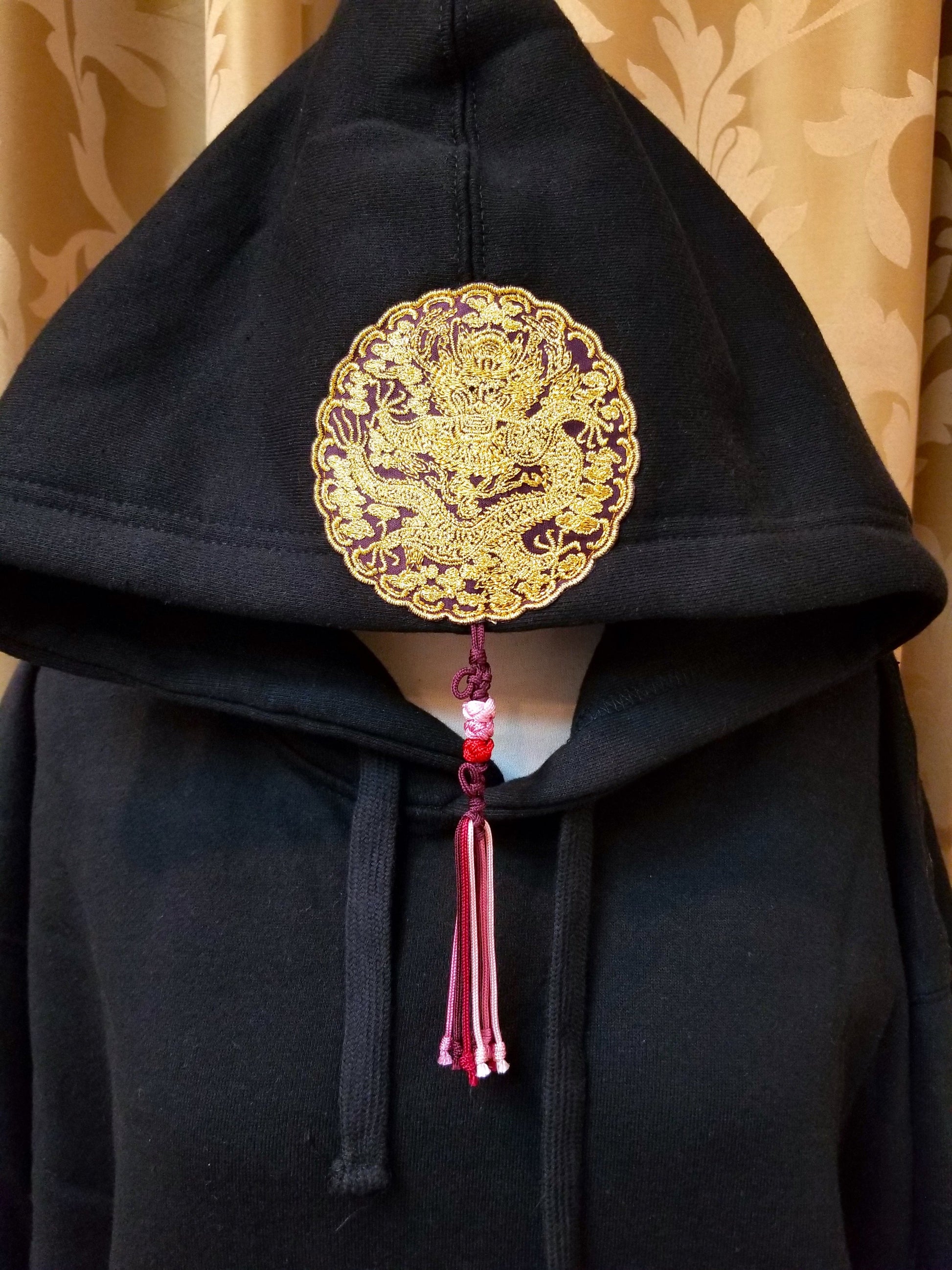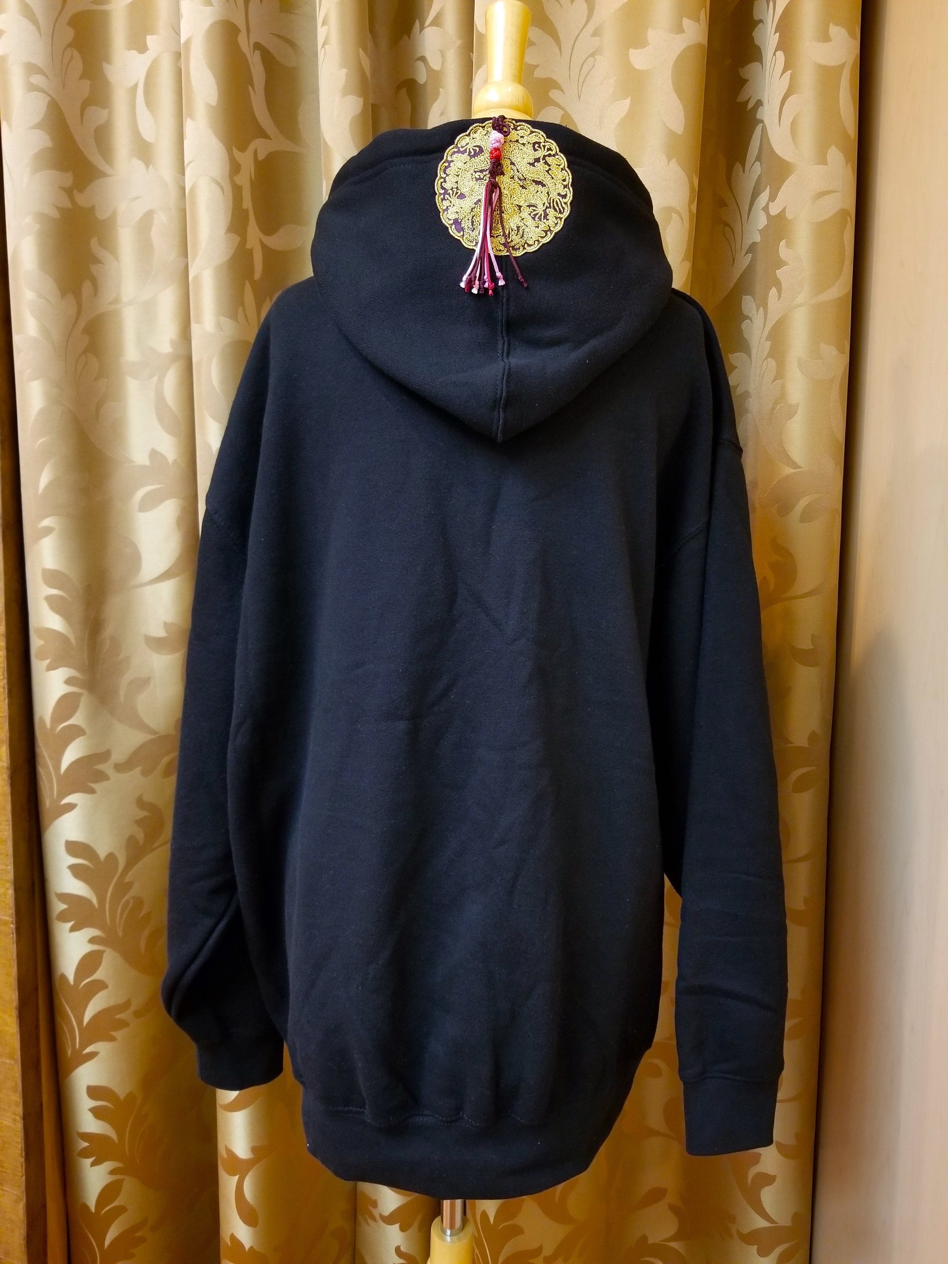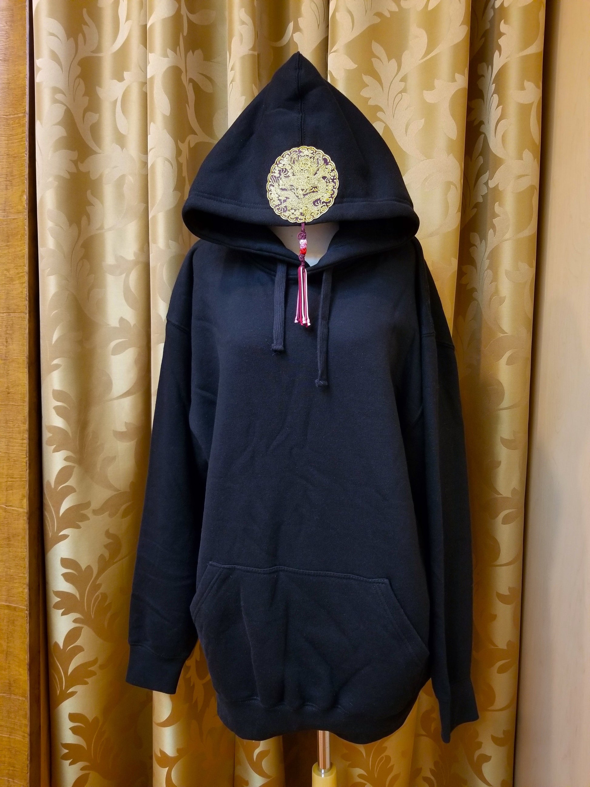 Exquisite dragon emblem and tassel hand-stitched to the hood of our 100% soft cotton hoodie. Hoodies are unisex sizes for an oversized fit.