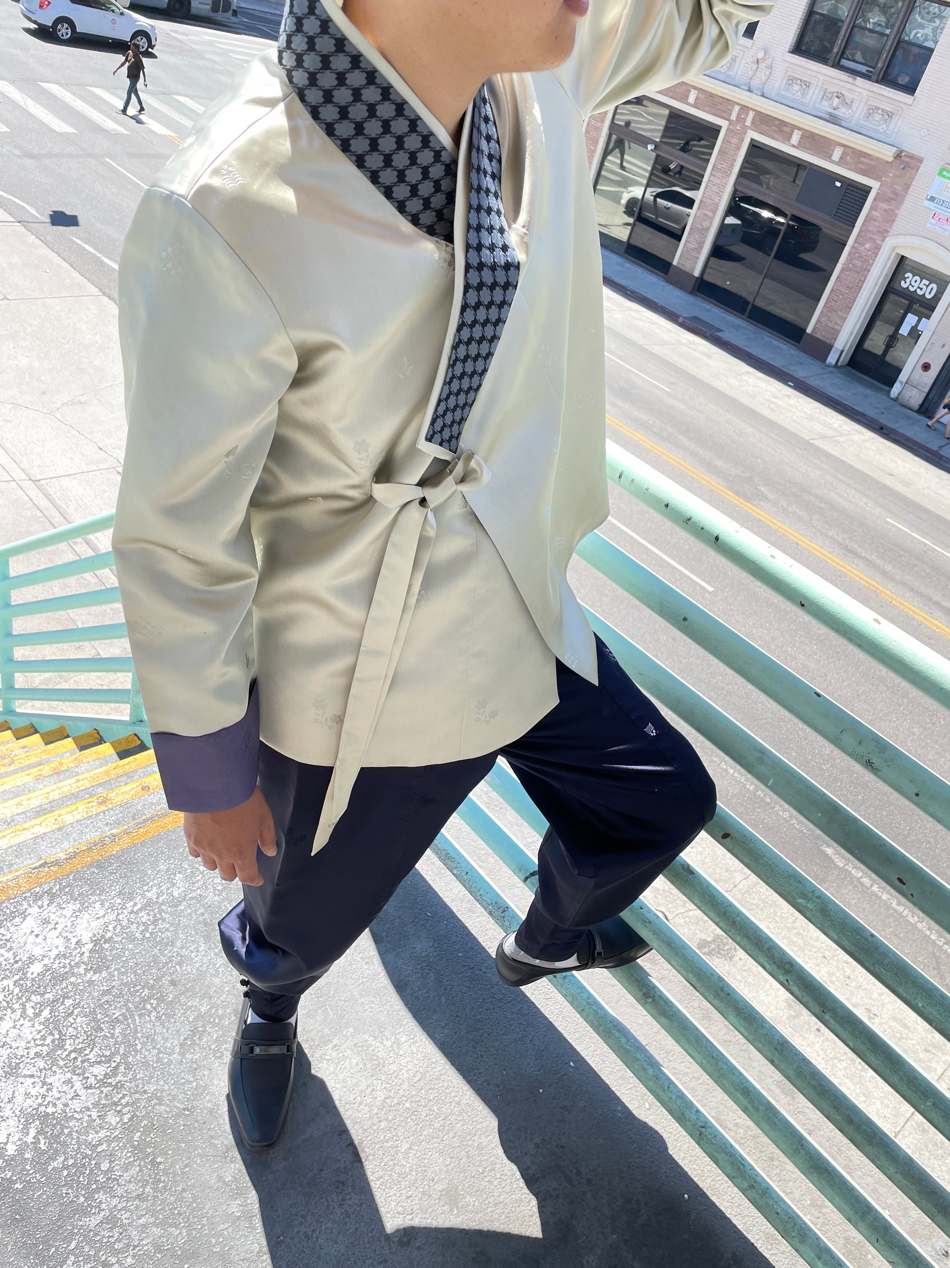 The Gentleman Jeogori Jacket is a cross between Korean tradition and the West! The modernized silhouette of the Jeogori Jacket with the houndstooth collar is the next versatile high-fashion 100% silk piece for your closet.