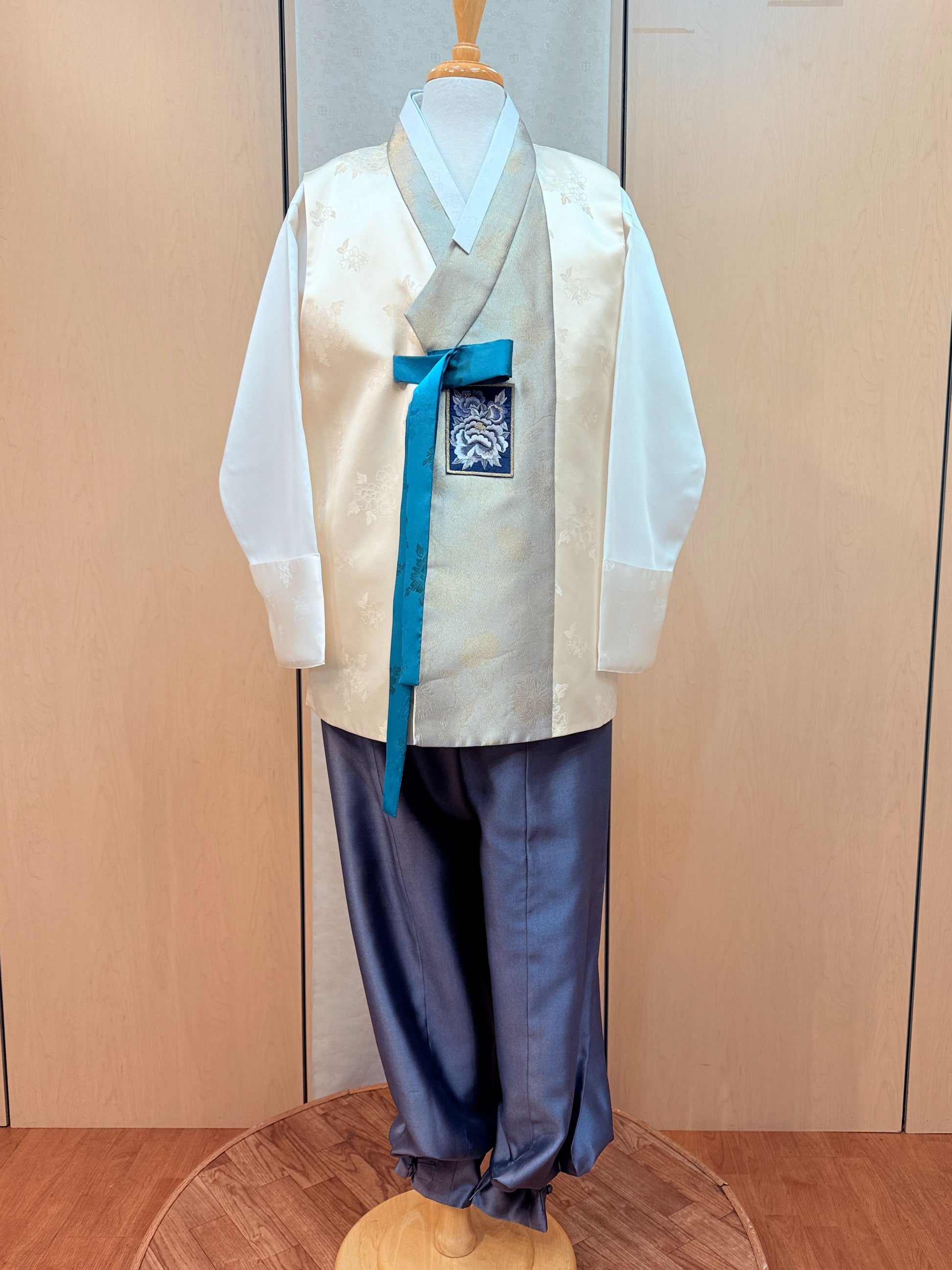 Short vest with hand-embroidered details paired with baji pants and jeogori top.