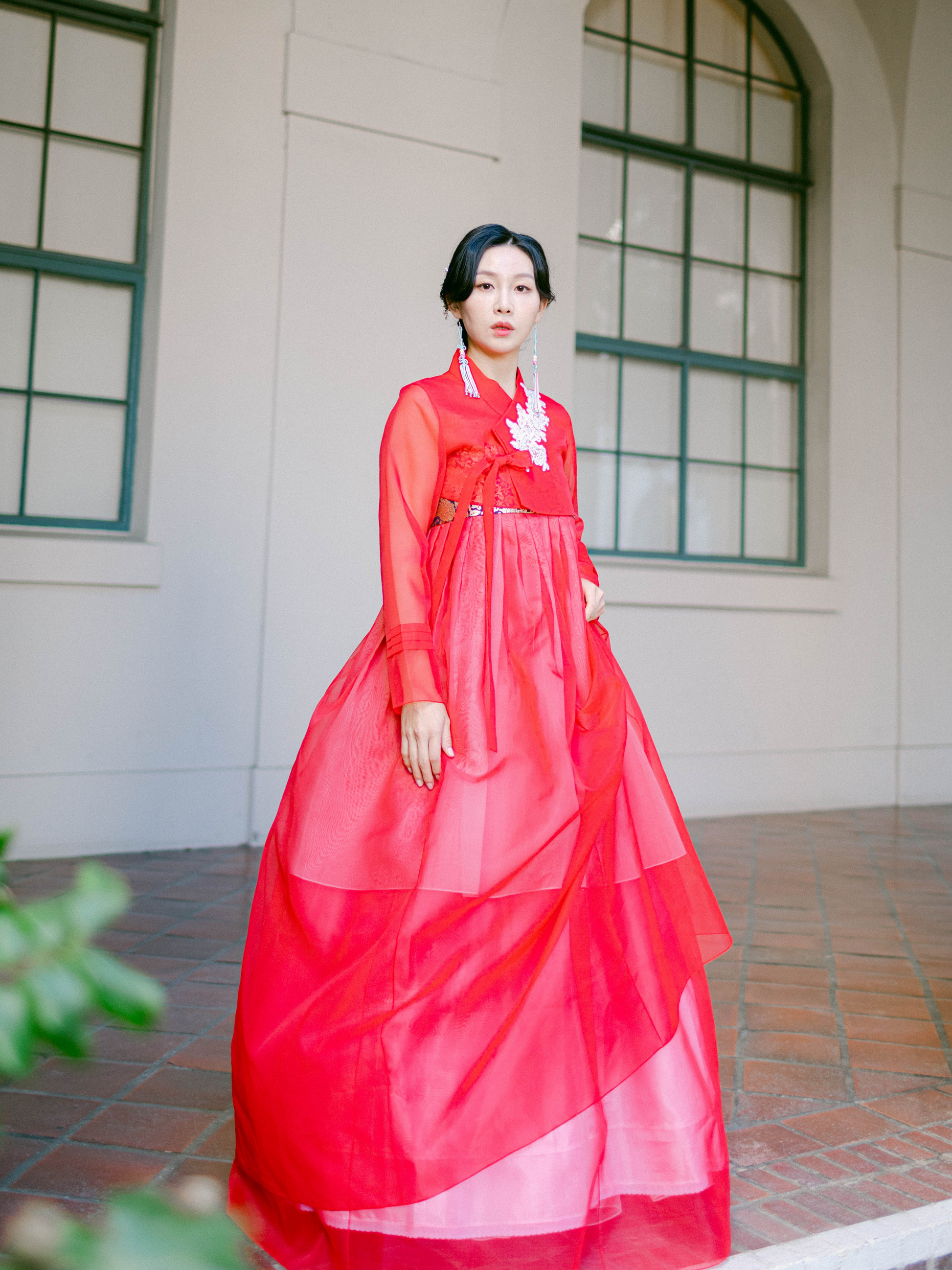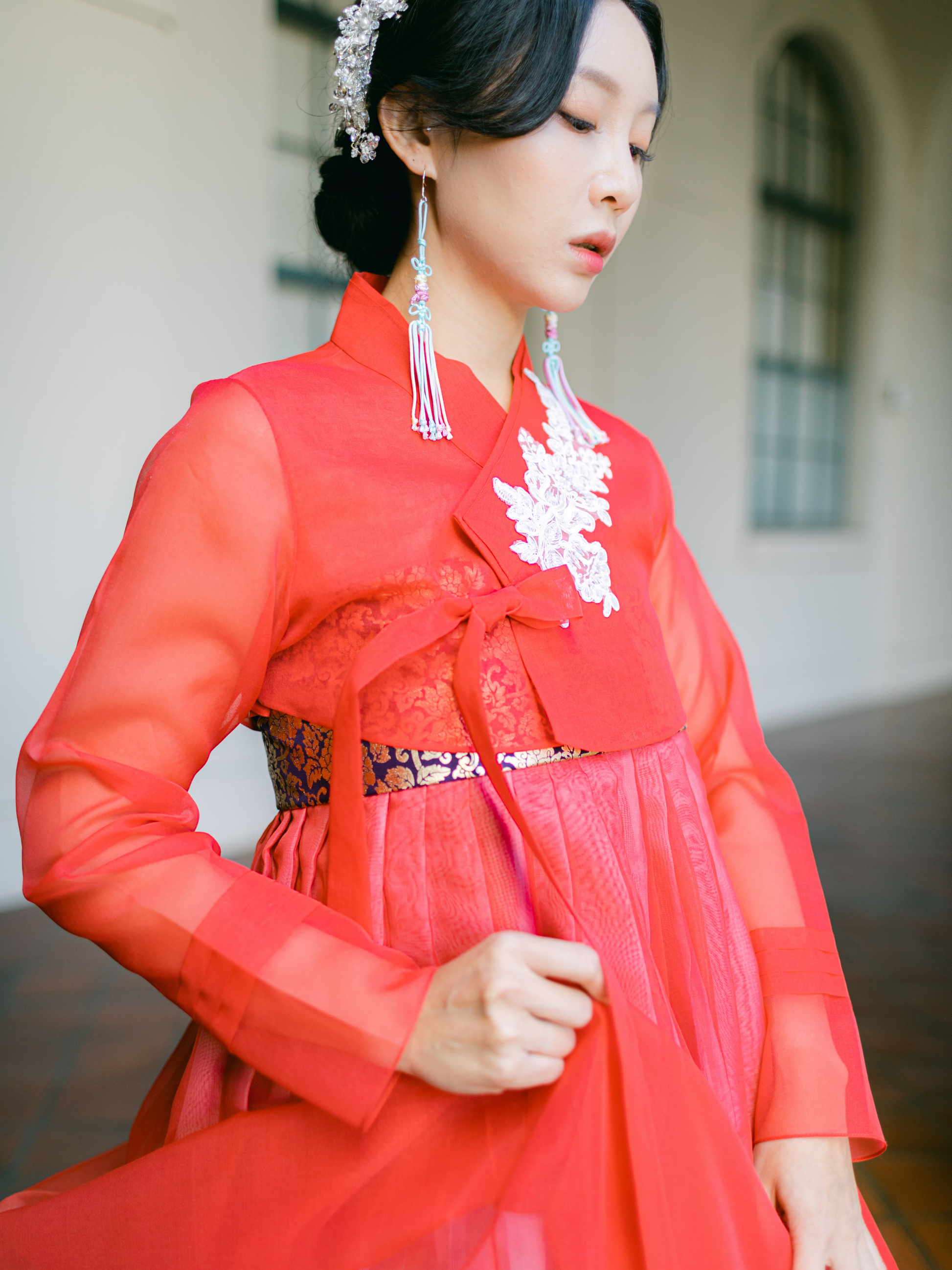 Modern red jeogori top with hand stitched floral lace appliqué. It can be paired with chima skirt or everyday clothes.