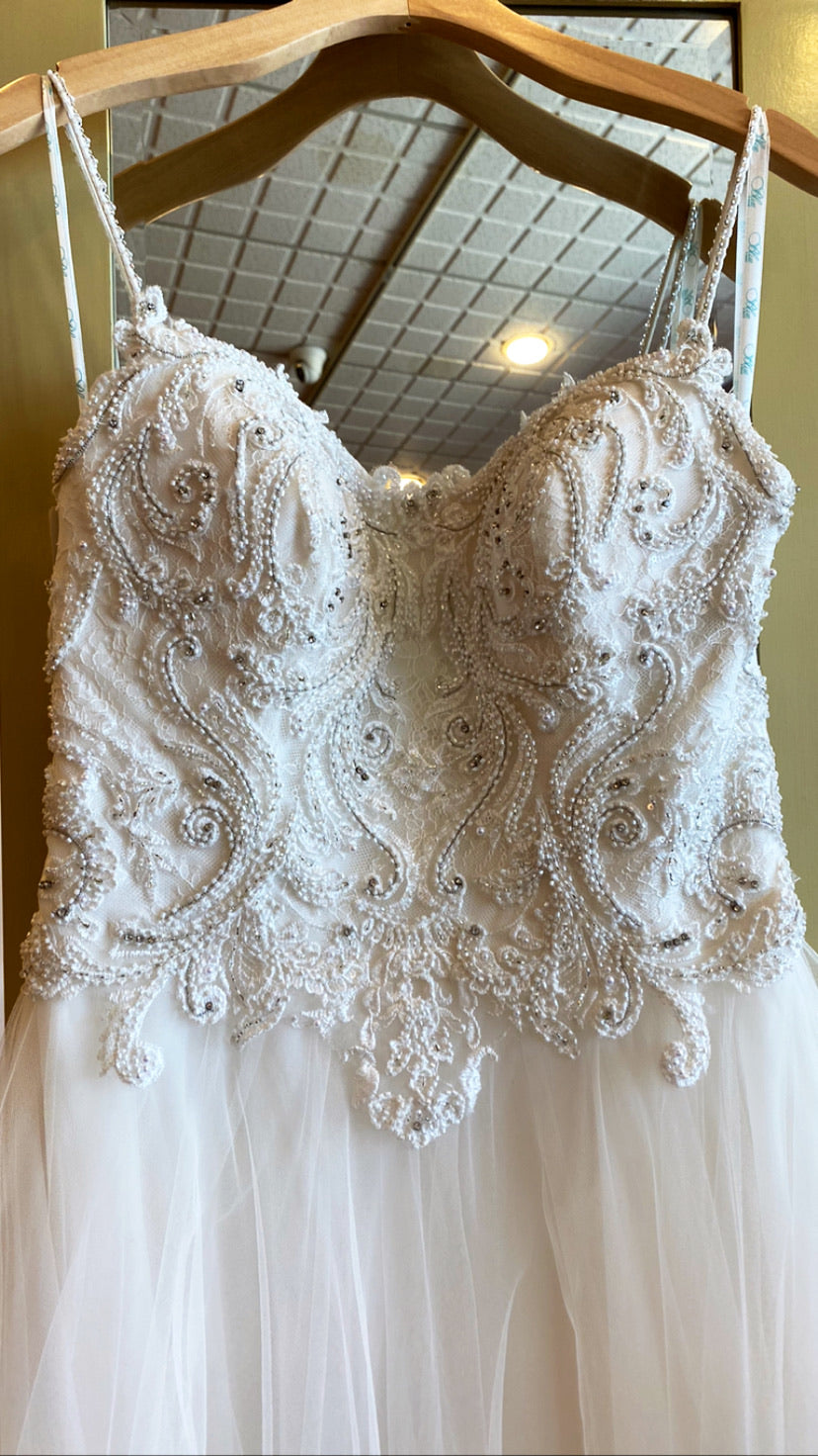 Our sample for sale is Ivory, size 8, and the lined version. (Can be altered down to a size 0. Alterations are separate)