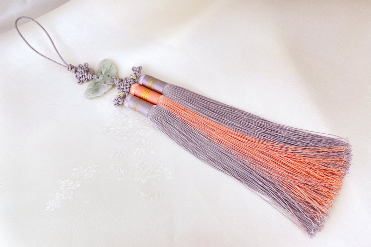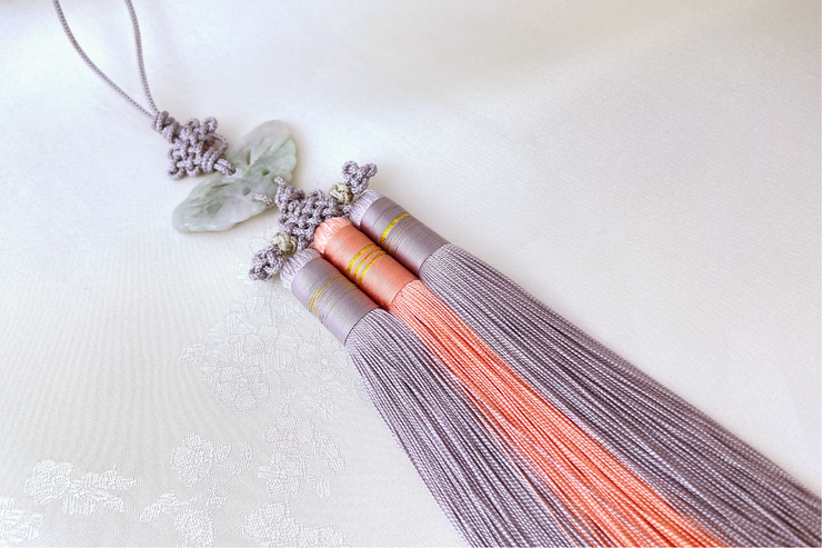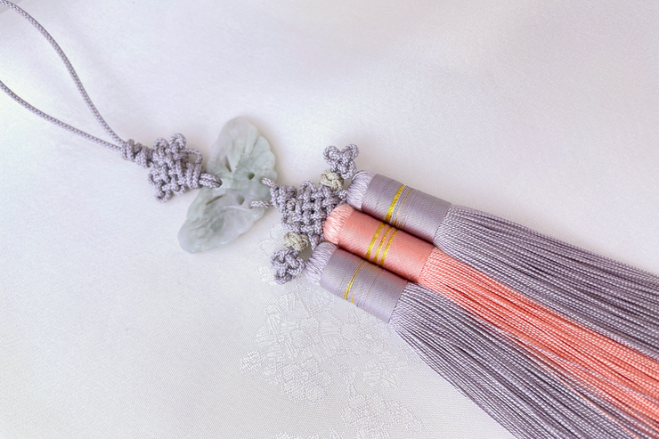 Salmon and pale purple norigae featuring a jade butterfly pendant. Wear this norigae with your hanbok or use it as a decorative piece in your home.