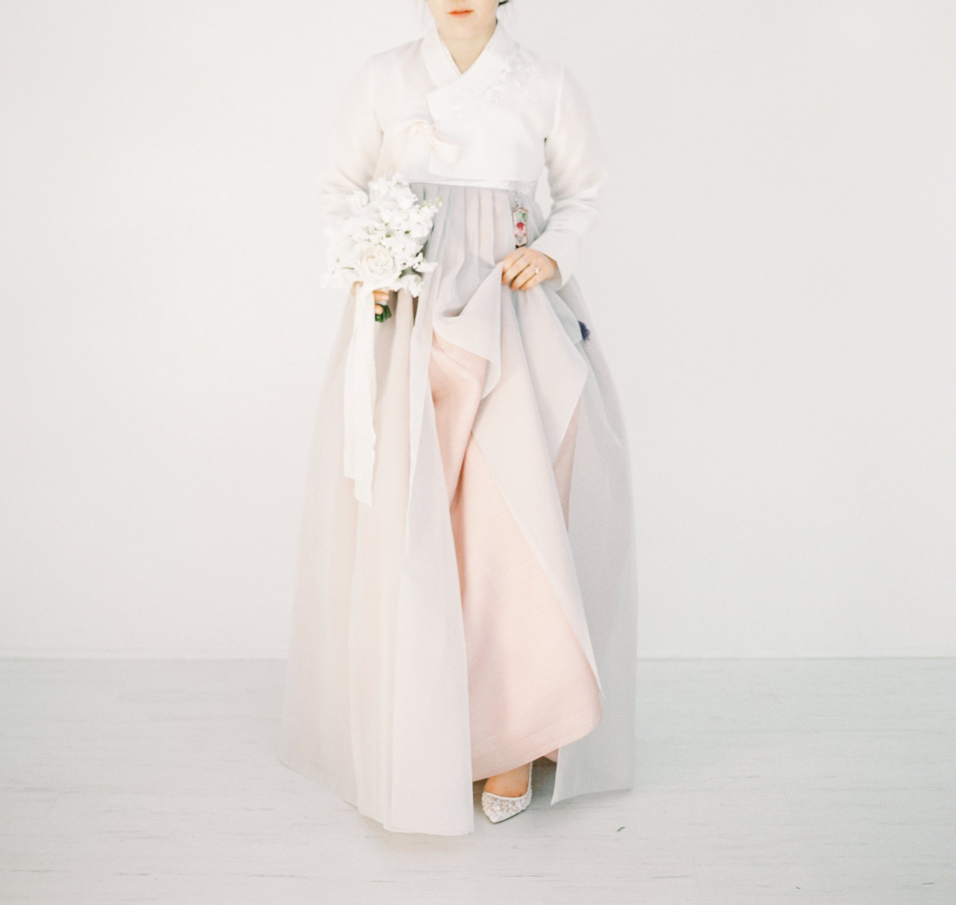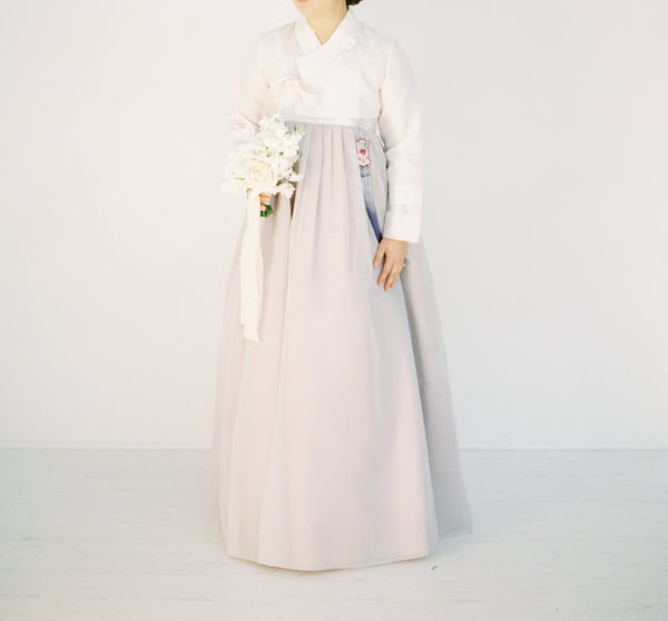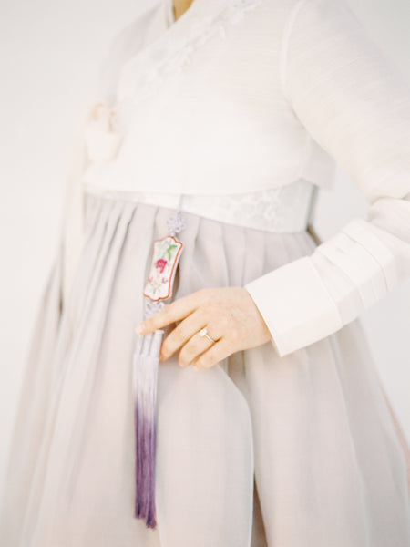 Beautiful white top with hand-sewn lace paired with a dusty pink-gray skirt. Woman-half of the Rosaline Set! This elegant hanbok is perfect for brides or parents.