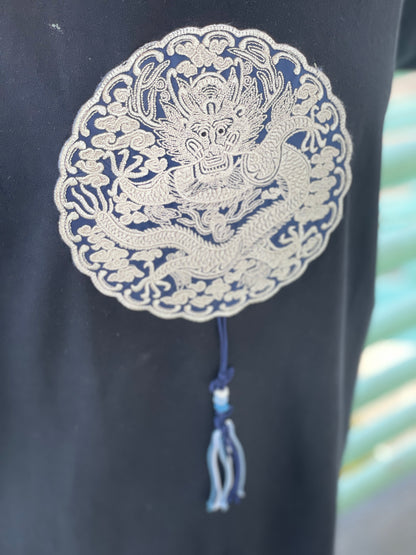 Exquisite dragon emblem and tassel embroidered to the front of 100% soft cotton t-shirt. T-shirts are unisex sizing for a baggy, oversized fit!