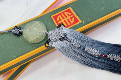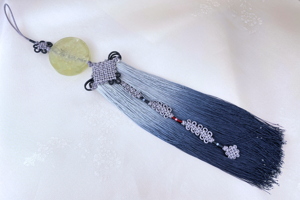 Deep blue ombre norigae featuring a round pure jade pendant. Wear this norigae with your hanbok or use it as a decorative piece in your home.