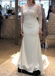 Lovely crepe mermaid dress with low waist and lace godets. A dress that creates a two-piece effect since it is combined with an illusion lace bodice and long sleeves, a flattering bateau neckline and v-back.