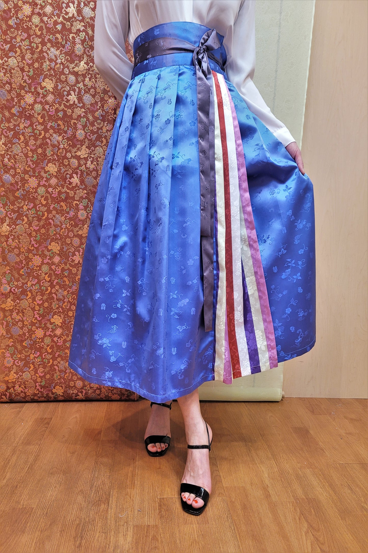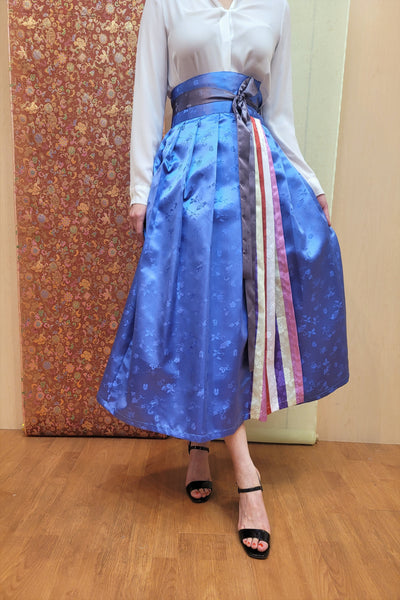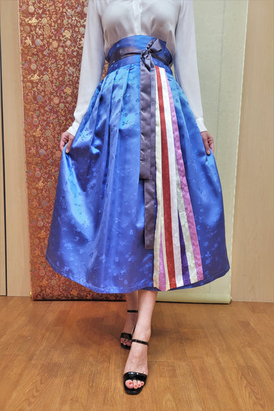 A modernized hanbok wrap skirt in our high quality hanbok fabric featuring traditional saekdong lines in a rich blue colorway.
